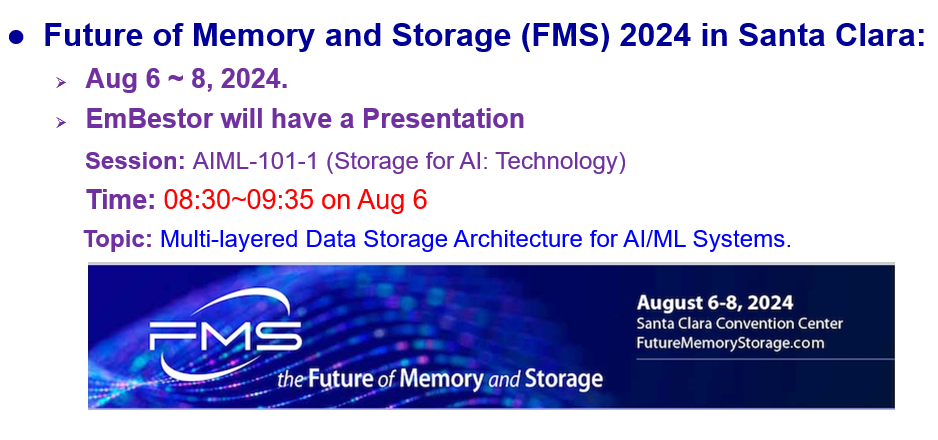 EmBestorは、2024年の「The Future of Memory and Storage」に参加し、AIおよび機械学習システム向けの多層データストレージアーキテクチャ、ならびに産業用フラッシュストレージ技術と製品について発表します。